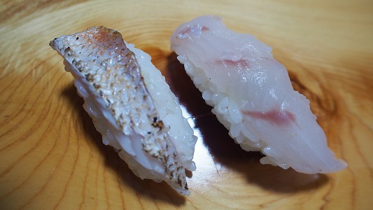 夏場に美味しいお魚の代表は、のどぐろ(魚神)です。白身のトロと言われるくらいに脂がのってます。炙りと皮ひきの握りを頂きました。炙りが特に脂ののりが分かります。美味しいです。
